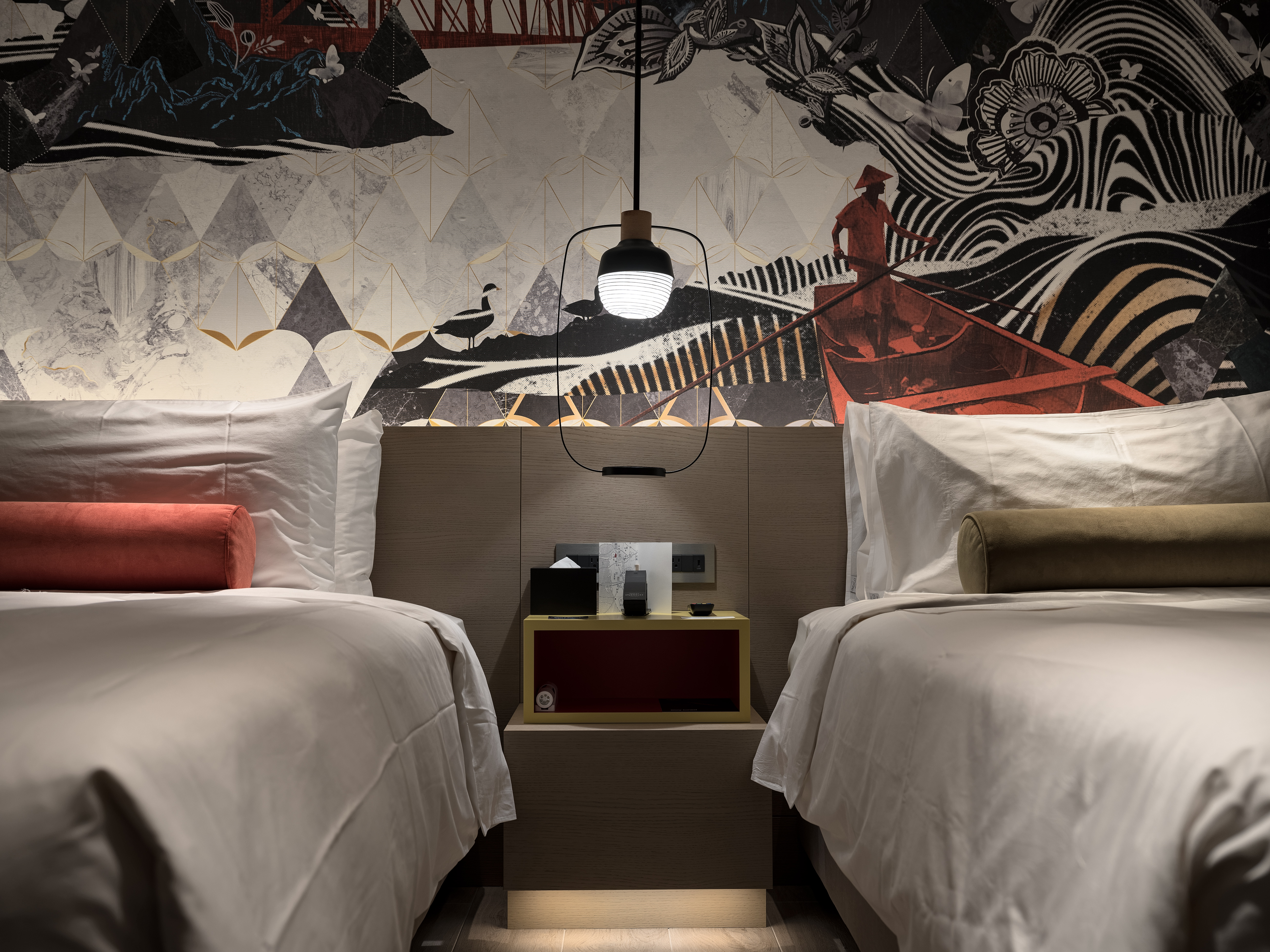 A: 我通常會從幾個面向來考量:首先是功能性,確保照明能滿足實際使用需求;再來是光源品質,包括整體的色溫、顯色性與舒適度;第三是防眩設計,避免造成視覺上的不適;最後則是與整體空間的融合程度,讓燈具不只是單一物件,而是成為空間氛圍的一部分。(編按:上圖為 台北英迪格酒店)