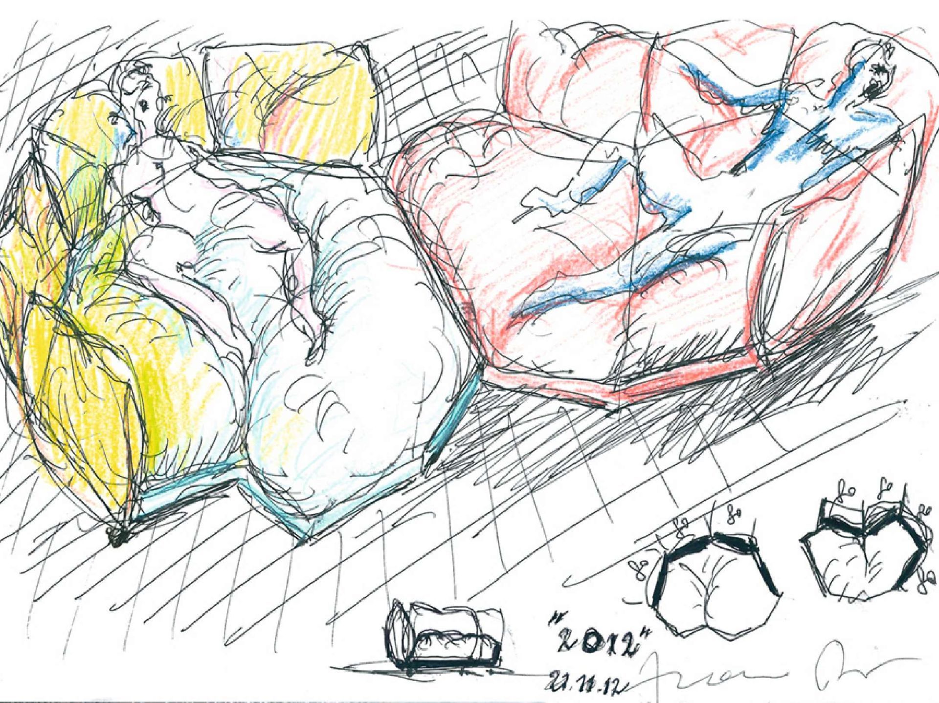 「我夢見在紅色沙漠中下了一場油雨。 黑暗強行進入,吞噬一切。 只剩下一片沙地。 當我醒來時,我想:『剩下的就是自由了』。 我拿起紙剪下它的輪廓,然後沿著邊緣做了一些小切線,切出了救生艇或飛碟。(編按:這是 Flap 沙發誕生的故事) 因為我們正生活在充滿希望的時代,或至少我們已經歷經了一個更接近安全、核戰噩夢已經過去的時代。 … 然後我們來到 2000 年前夕,太空!未來!自由是真實的!」。 幾年後,Sfatto 沙發誕生。 我們擔心的千禧年革命並沒有發生。「我感到西方世界的疲乏,而這種疲乏又帶來了對西方文明的倦怠。 一種衰敗的感覺油然而生。Sfatto 雖然有著中產階級的靈魂,但它並不合常規,它總是包含著不規則。 或者它本身就是一種不規則症。」