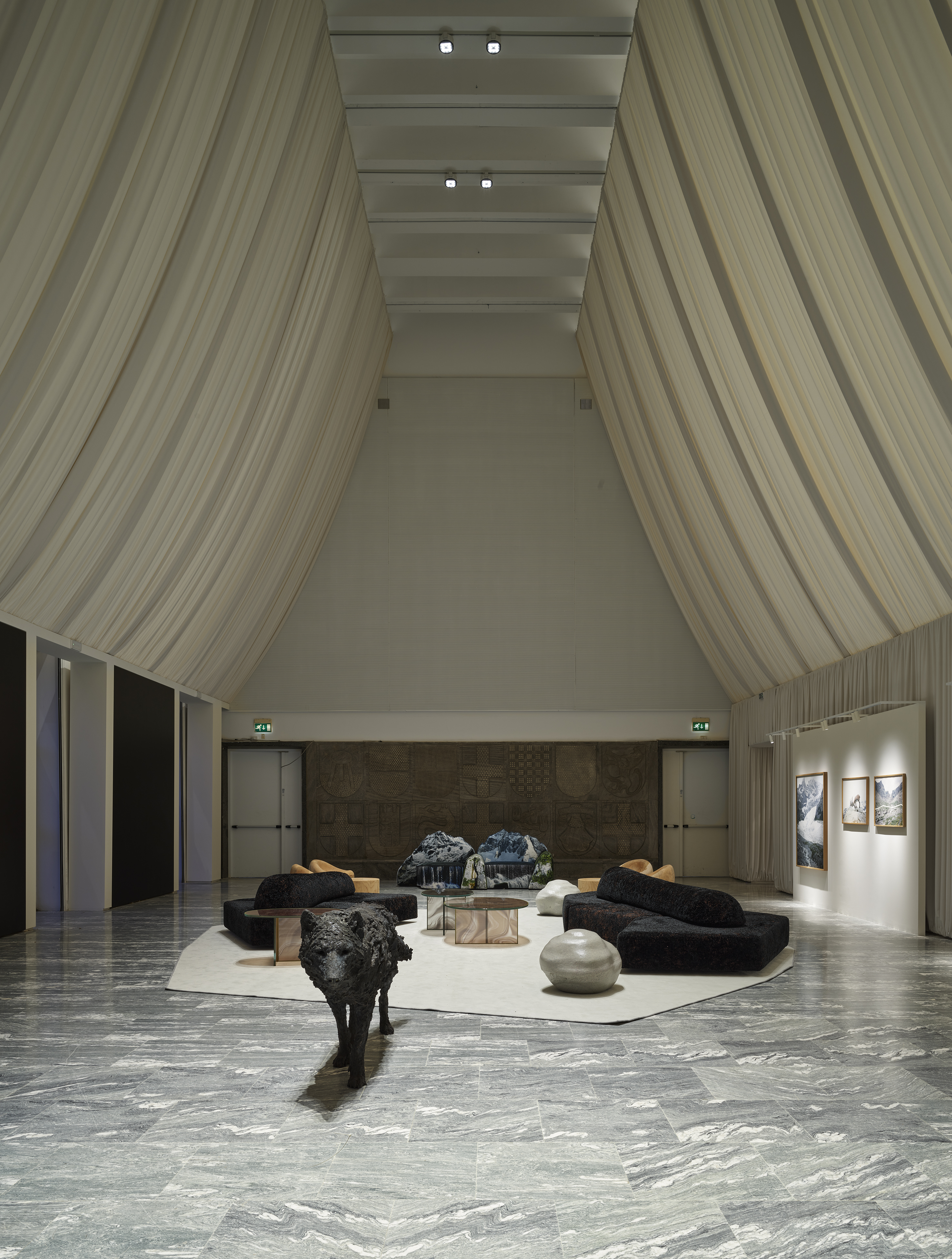 貫穿一切的是義大利設計——不是作為一個展出分類,而是一種橫跨領域的語言。合作的品牌家具除了 Edra,還包括了 B&B Italia、Ethimo、Glas Italia、Poltronova、Riva 1920、Gufram、Meritalia、Impatia、Flos 等。這些傢俱並不是做為舞台背景,而是用來建構氛圍的主角。身為主要贊助商,Edra 更針對場域特質,將岩石、動物、積雪等靈感與空間結構深度揉合,將抽象的主題轉化為「可觸碰的藝術品」。