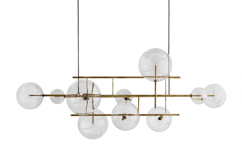 Bolle 水平系列吊燈有十燈球 (A) 與十六燈球 (B) 兩個版本。選用 LED 光點 (G4燈頭,色溫2700) 搭配球狀透明口吹玻璃燈罩、手工打磨黃銅的骨架,並可調光。獨特的手工打磨黃銅工藝,讓表面擁有自然的不歸則紋理與斑點,每件作品都獨一無二。吊燈均附長四米的電線。