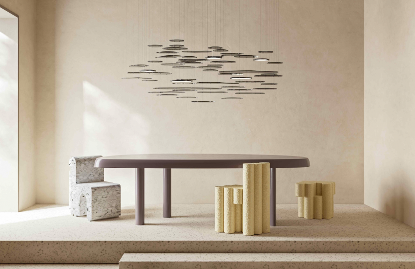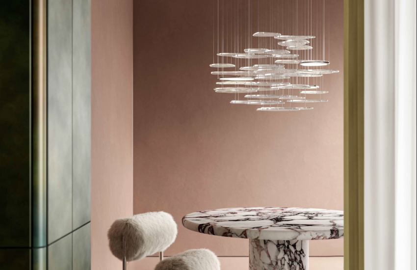 就在這樣的空間明暗對比中,Bruma 吊燈誕生了。Bruma 吊燈系列的設計嘗試在虛與實之間取得平衡:貌似隨意的結構、編排、與材質在此精準交織,創造出一抹留白。燈體本身由眾多金屬鑲嵌的玻璃片組合而成,它們像浮冰一樣層層交會在空中,並以傳統威尼斯工藝燒製,內蘊無數氣泡。當燈光開啟,能為空間渲然出充滿質地感的光影。Giopato&Coombes 獨家薄膜 LED 燈片隱身其中,成為風景的一部分。