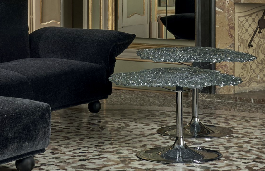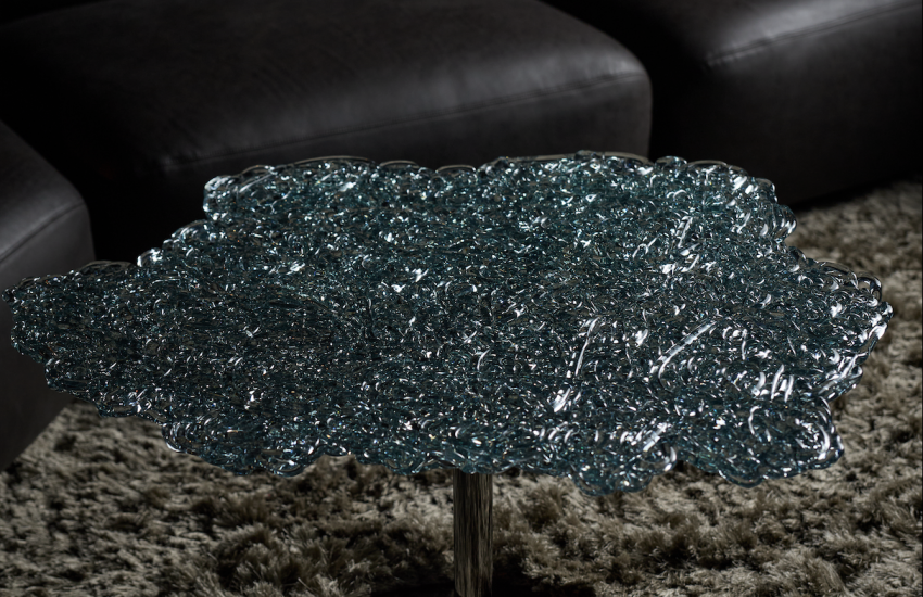 適用於沙發與扶手椅旁的大桌面邊桌、咖啡桌。以超高透明度的聚碳酸酯材質製成,呈現如綠色玻璃般的效果,並以手工將一道道透明線條 ‘編織’ 成形。