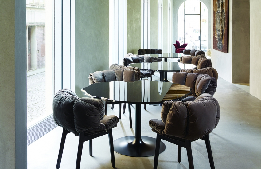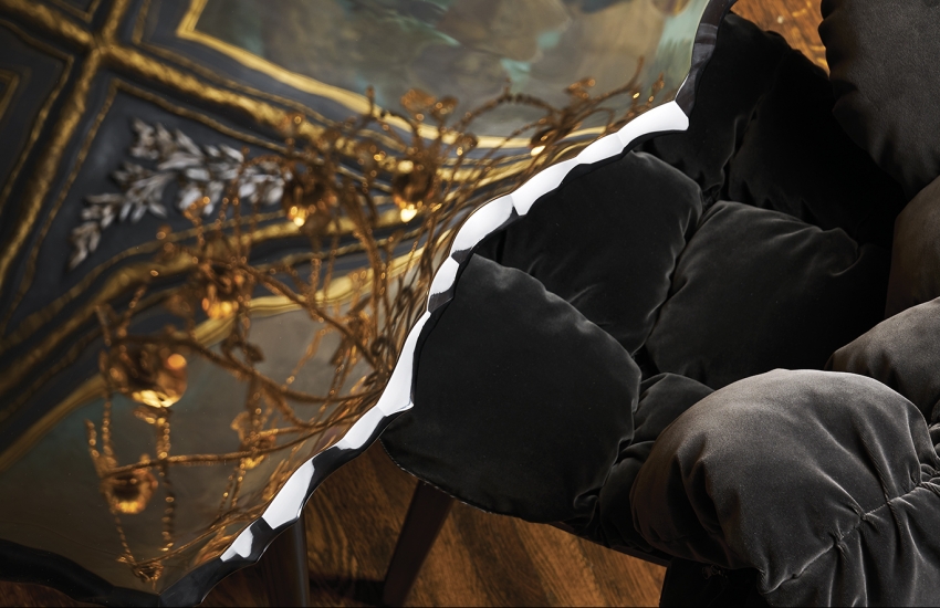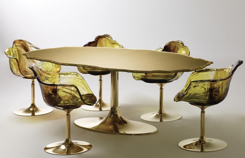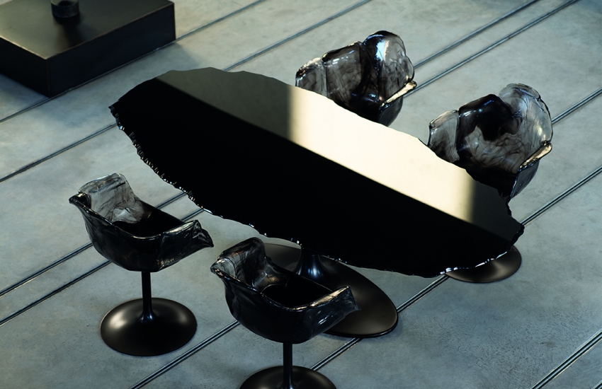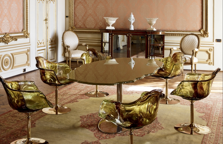玻璃的純粹在其流動、有機的形態中被充分彰顯。桌面有黑色或金色亮漆可選,其表面如同水的碎片或水晶的切片般,捕捉並反射光線。搭配四條錐形桌腳或鬱金香式錐形底座,Egeo 能輕鬆融入任何環境——從當代居家到商業室內皆宜。