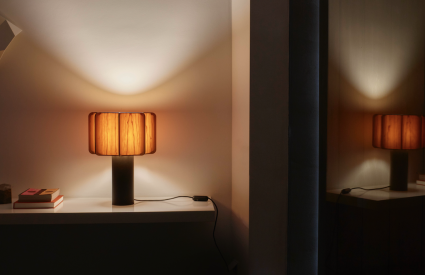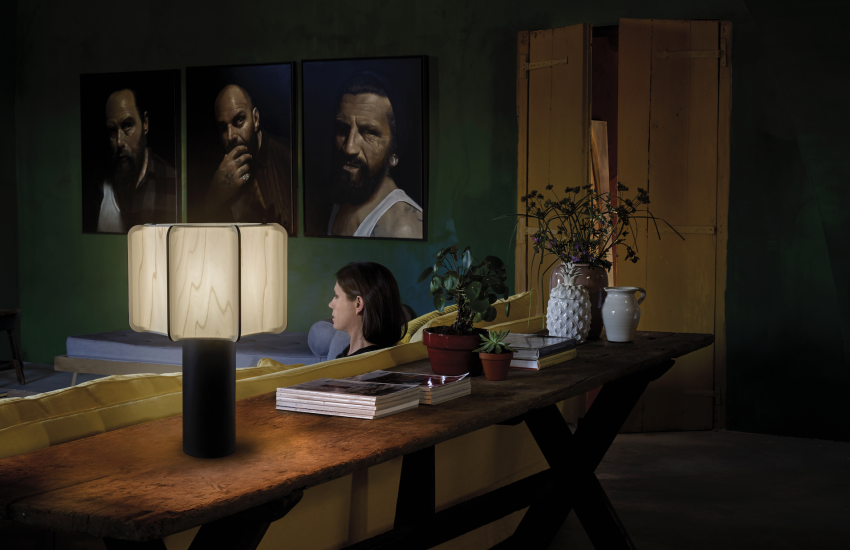 Kactos桌燈外型設計受大自然所啟發,多片木質飾板以垂直內凹形式排列在光源周圍,並以壓克力框架固定,構成如仙人掌剪影般的外型。當光線向外擴散,不同木色的紋理、色澤,為空間營造出分外雅緻溫潤的氛圍。。