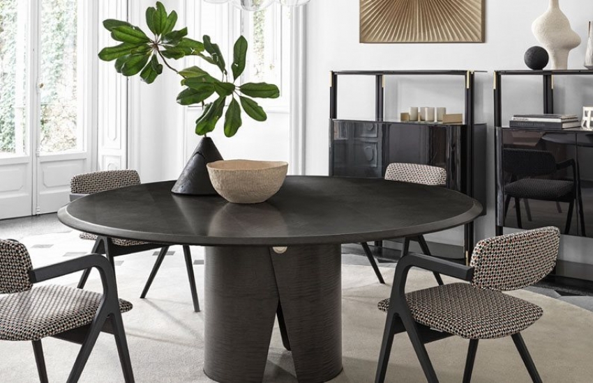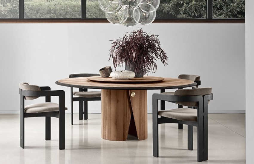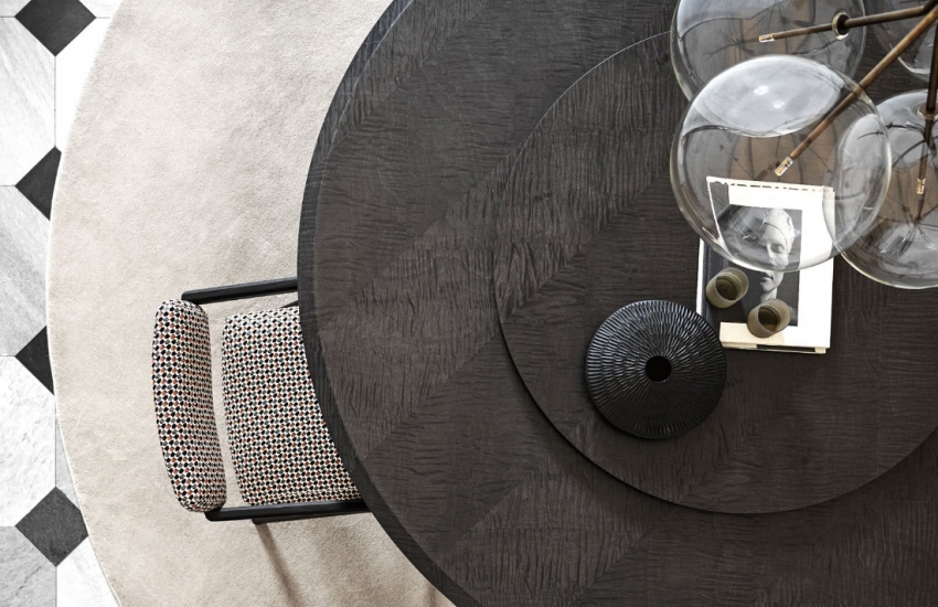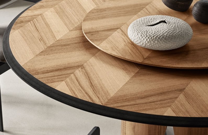 Manto 餐桌有多種飾面可供選擇:鑲嵌對比鮮明的黑色桌邊的濃郁胡桃木紋版( Colore Frisè Walnut herringbone wood inlay)、或是深灰色楓木版 (Dark grey Frisé Maple)。 桌緣裝飾著 60mm 導角,它是一張兼具優異實用性與精緻設計的餐桌。選配的轉盤,具有與桌面相同的飾面,木紋與桌面完美呼應。