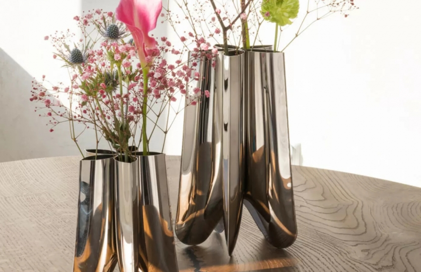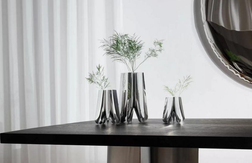 Rotation 花器展現了一種和諧重複的美感。沿著軸線環繞而生的幾何造型,像花瓣般展開,創造了 Rotation 花器獨特的視覺語彙。它的造型引導著植物枝條往意想不到的方向延伸:一段金屬雕塑與花藝構圖的邂逅。