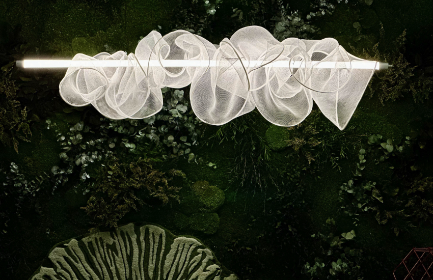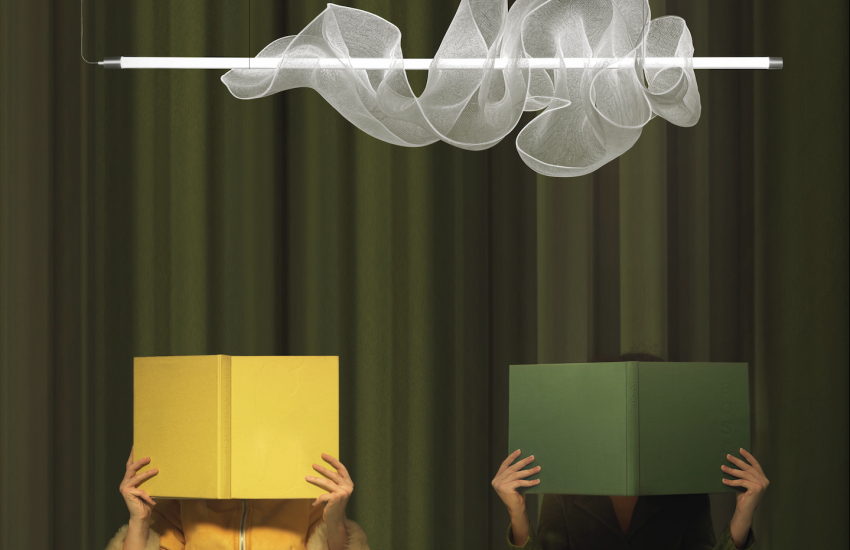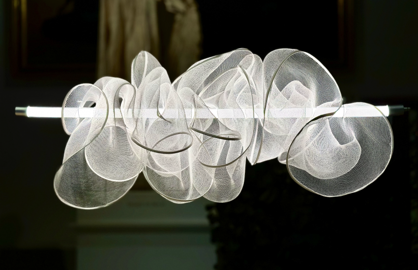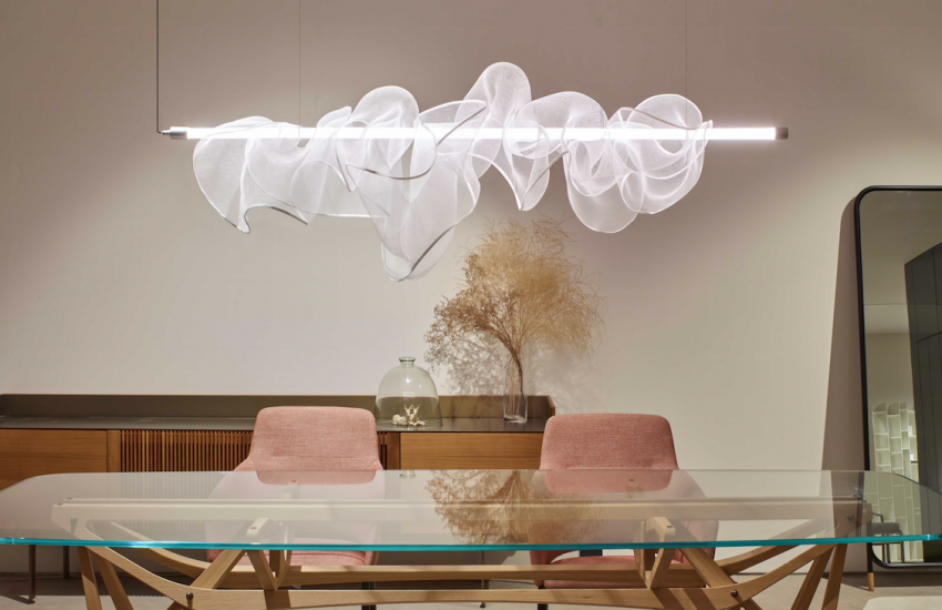 這盞如夢境般的吊燈向移動中的雲朵致敬:雲的出現、重塑和消散。半透明的織品透過 Candela Cort 的巧手拿捏結合光線,生動地訴說了這個雲朵故事。